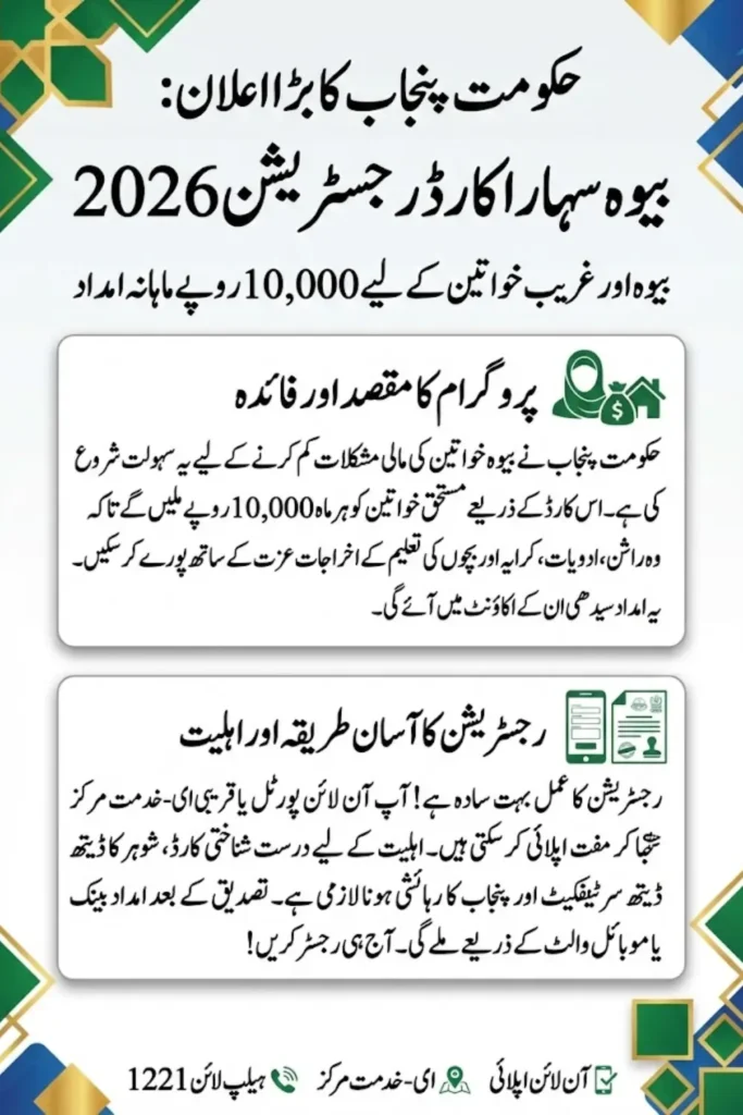 Bewa Sahara Card Registration 2026 is a social protection program created to support low-income widowed women living in Punjab. The initiative operates through the Punjab Social Protection Authority and uses digital verification systems to ensure that financial assistance reaches deserving beneficiaries without delays or corruption.