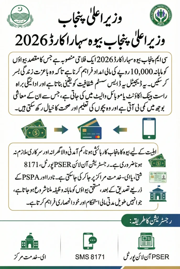 The CM Punjab Bewa Sahara Card 2026 Online Registration program is a significant step toward empowering widows in Punjab. By providing Rs. 10,000 per month through a transparent digital system, the government ensures financial security and dignity for vulnerable women. The combination of strict verification, multiple registration options, and direct payments makes this initiative reliable and accessible.