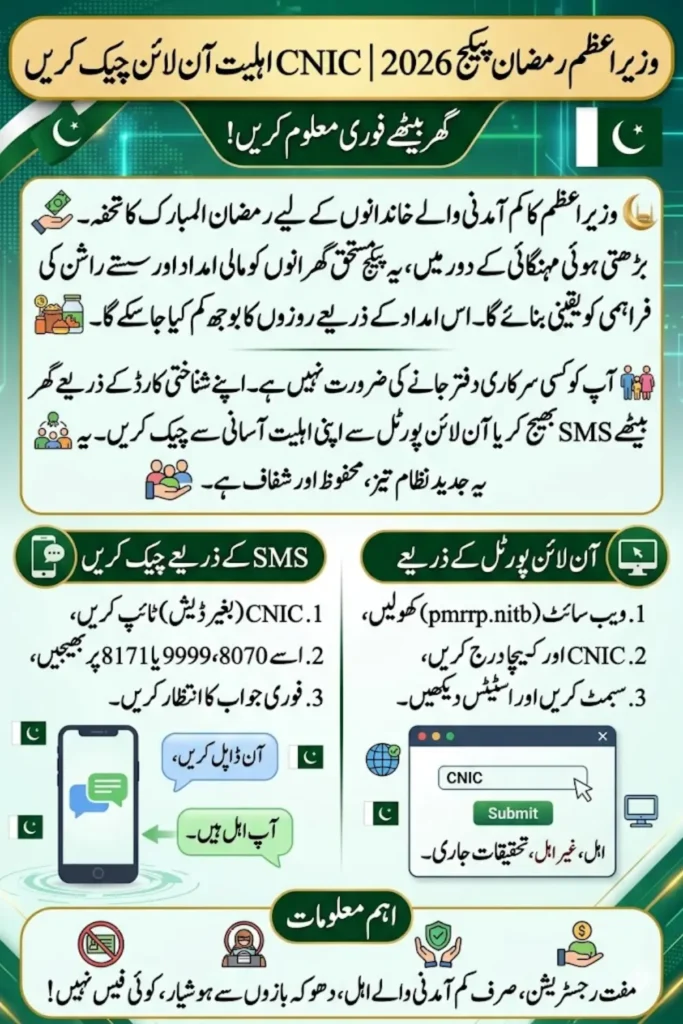 The Prime Minister Ramzan Package 2026 is a government initiative aimed at providing financial support and essential food subsidies to low-income families during the holy month of Ramadan. With rising inflation and household expenses, these relief programs are designed to ease the burden on deserving households. Citizens across Pakistan now have the convenience of checking their eligibility online or via SMS using their CNIC, without visiting government offices.