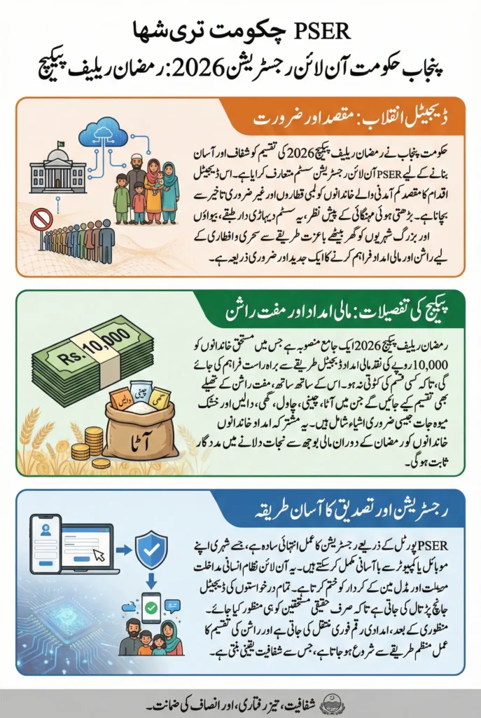 PSER Punjab Gov PK Online Registration 2026. The Punjab Government has officially introduced the PSER Punjab Gov PK Online Registration 2026 system to streamline the Ramzan Relief Package distribution process across the province. This digital initiative is designed to help low-income and deserving families receive financial assistance and free ration without facing unnecessary delays. In previous years, many citizens had to stand in long queues outside government offices. This time, the government has shifted the entire process online to ensure transparency, speed, and fairness.