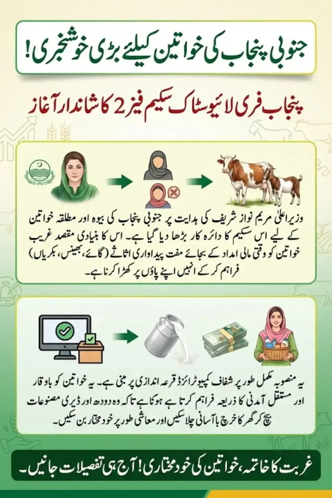 Punjab Free Livestock Scheme Phase 2 Punjab Free Livestock Scheme Phase 2 Launched under the direction of Chief Minister Maryam Nawaz Sharif to support widows and divorced women across South Punjab. After the successful completion of Phase 1 in 12 districts, the Punjab Government expanded the program to include more deserving beneficiaries. The main objective is to reduce poverty by providing productive assets instead of short-term financial aid.